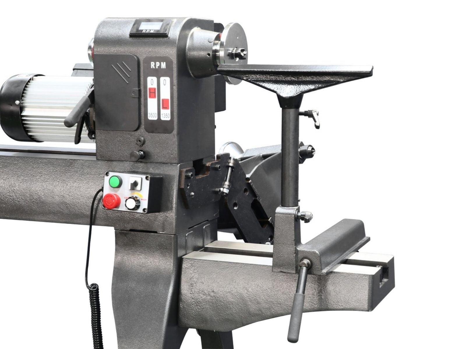 Im Inneren arbeitet ein leistungsstarker 2,25-kW-Motor, gesteuert über einen hochwertigen Delta-Frequenzumrichter. Zwei Drehzahlbereiche decken langsames, sicheres Schalen-Andrehen ebenso ab wie feinere Arbeiten bei höheren Drehzahlen. Die magnetische Steuerbox mit Drehzahlanzeige lässt sich dort positionieren, wo sie am besten erreichbar ist.