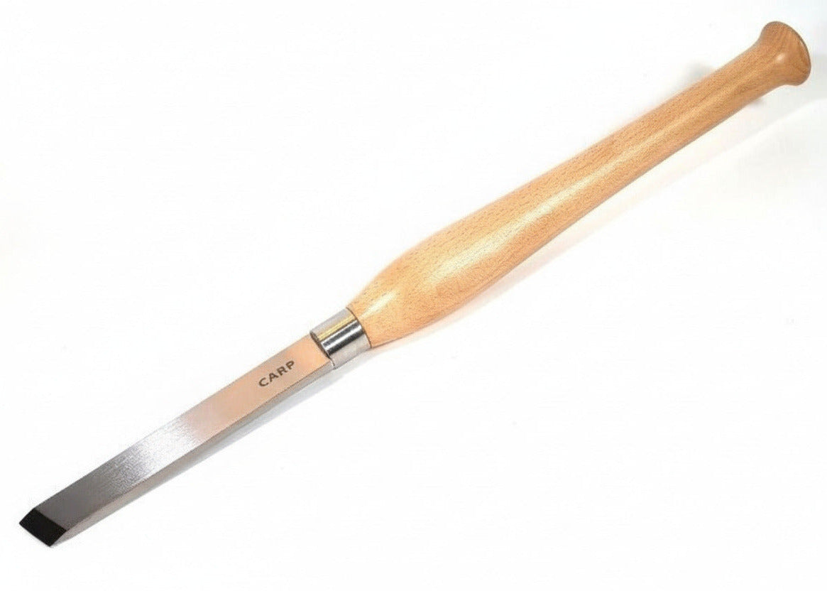 Großer CARP Flacheißel 25 mm für planierende und glättende Schnitte. Mit seiner etwas breiteren Schneide als die kleinere 19mm-Varianten bietet er eine ausgewogene Mischung aus Kontrolle und Fläche – ideal für mittlere Spindelprojekte, Übergänge und feinere Flächenarbeit an der Drechselbank.