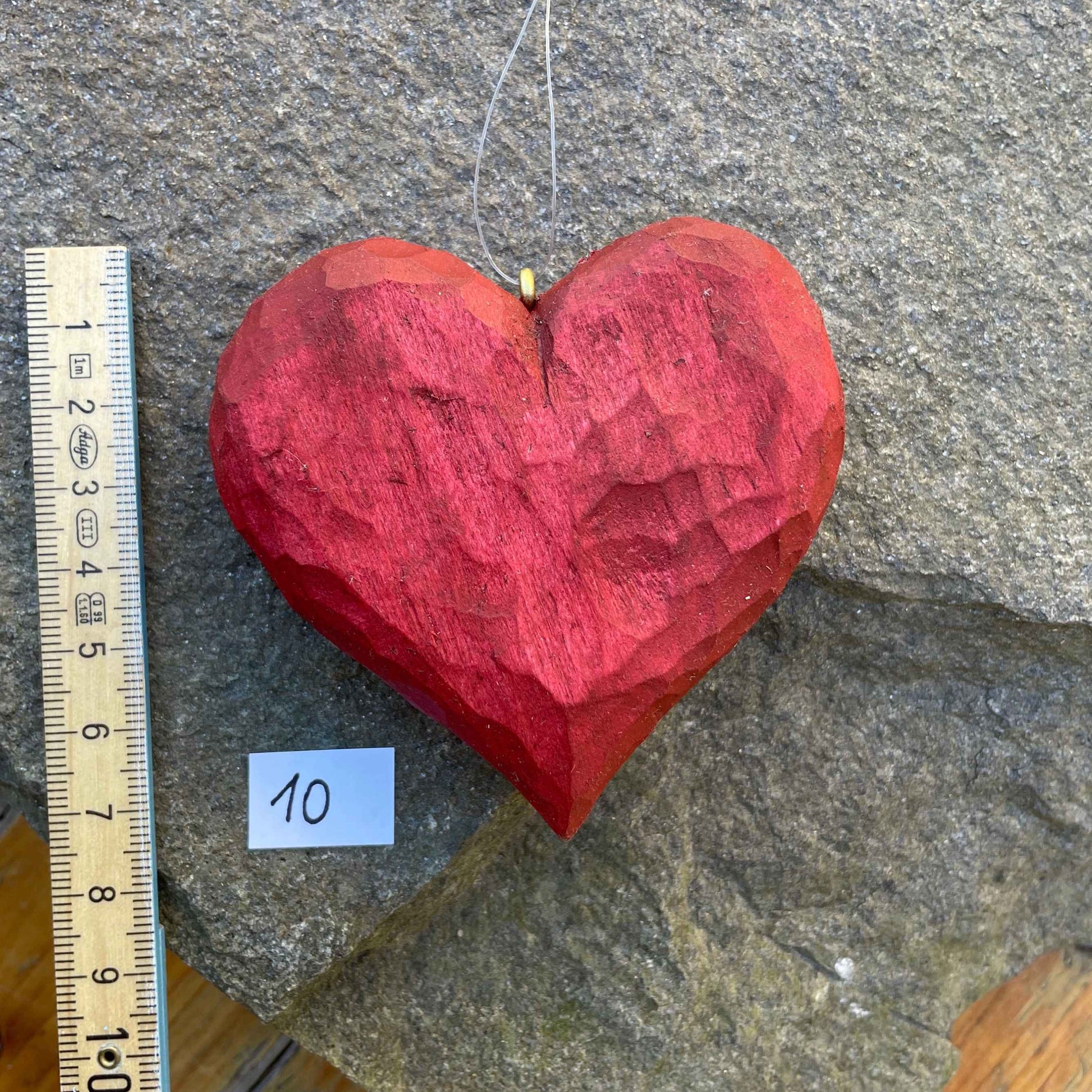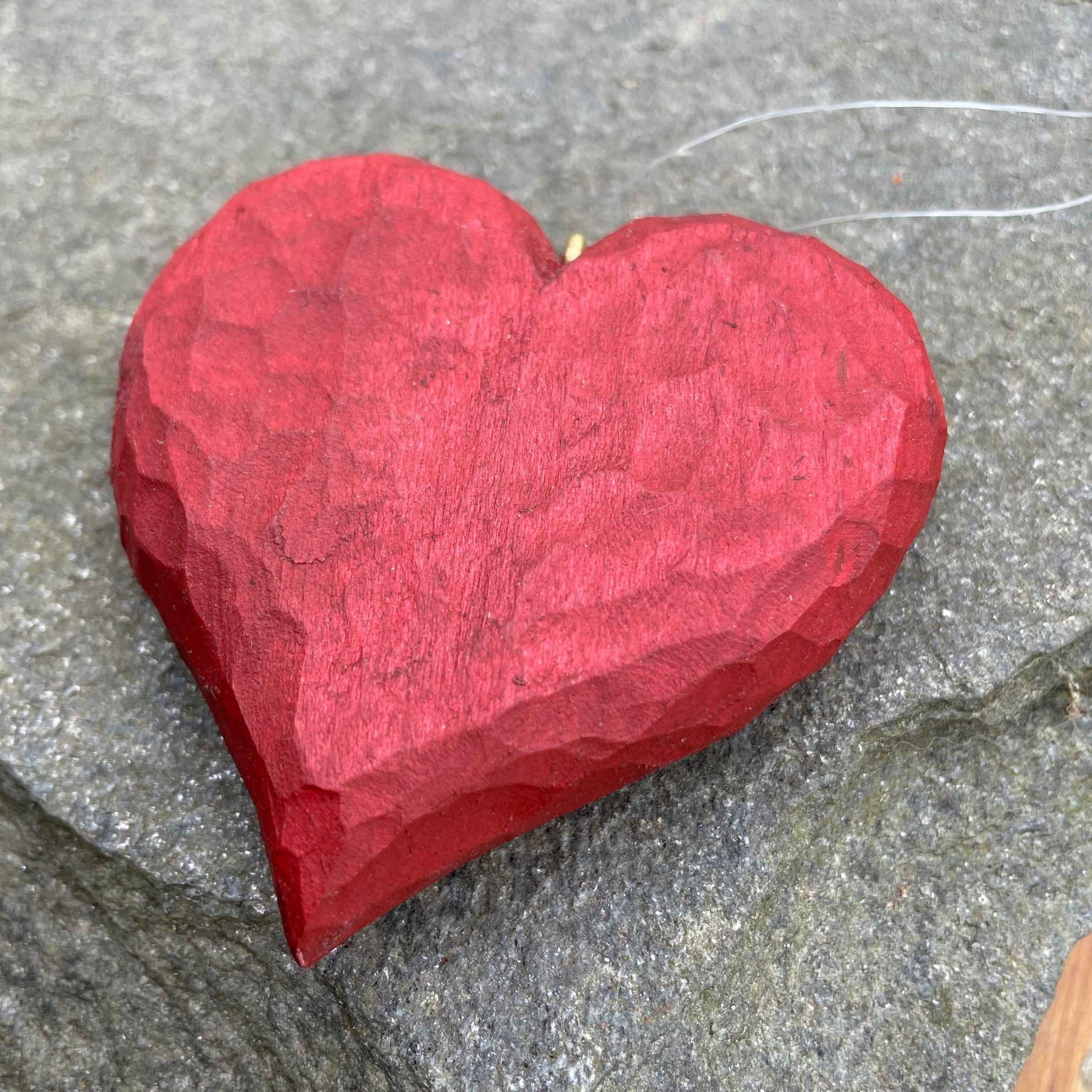 Fein von Hand geschnitzt – ein leichtes, flaches Lindenherz mit klarer Kontur. Die Oberfläche ist dunkelrot eingefärbt, sodass die natürliche Maserung dezent sichtbar bleibt. Echte Erzgebirgs-Handarbeit, kein Serienprodukt.