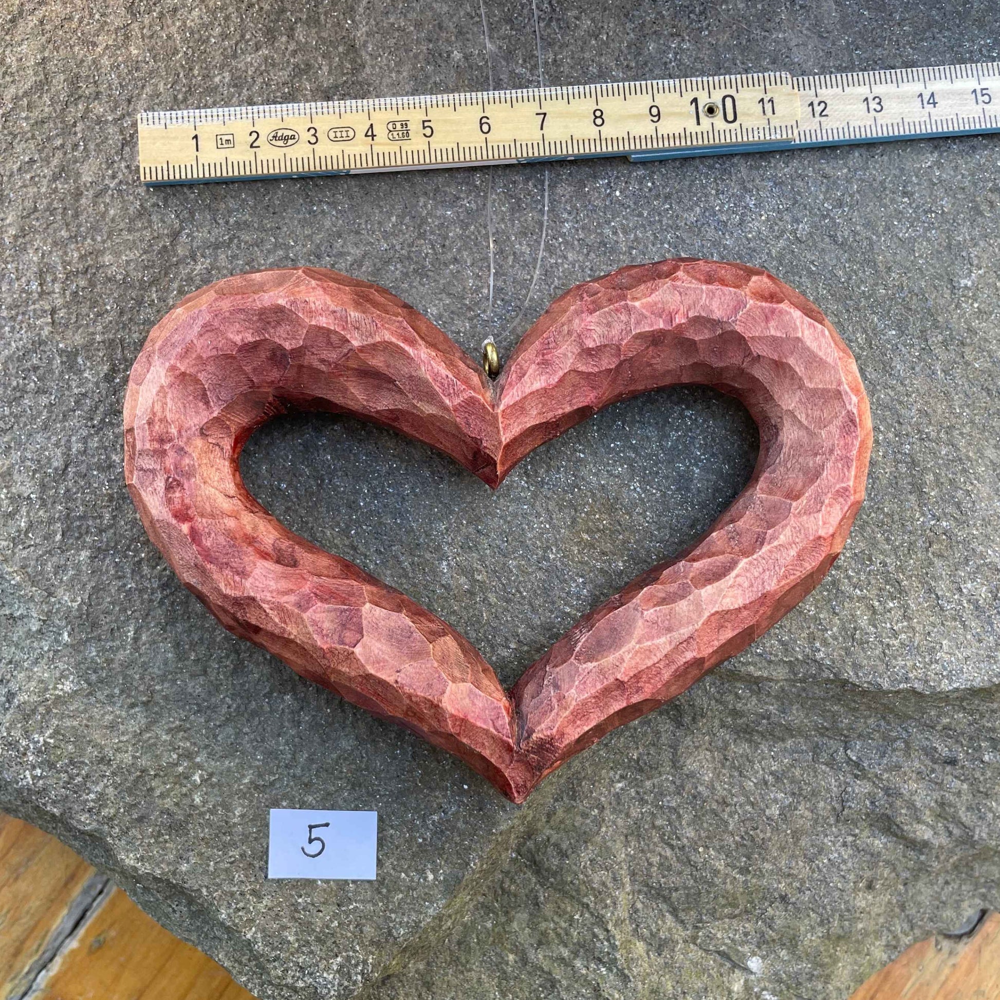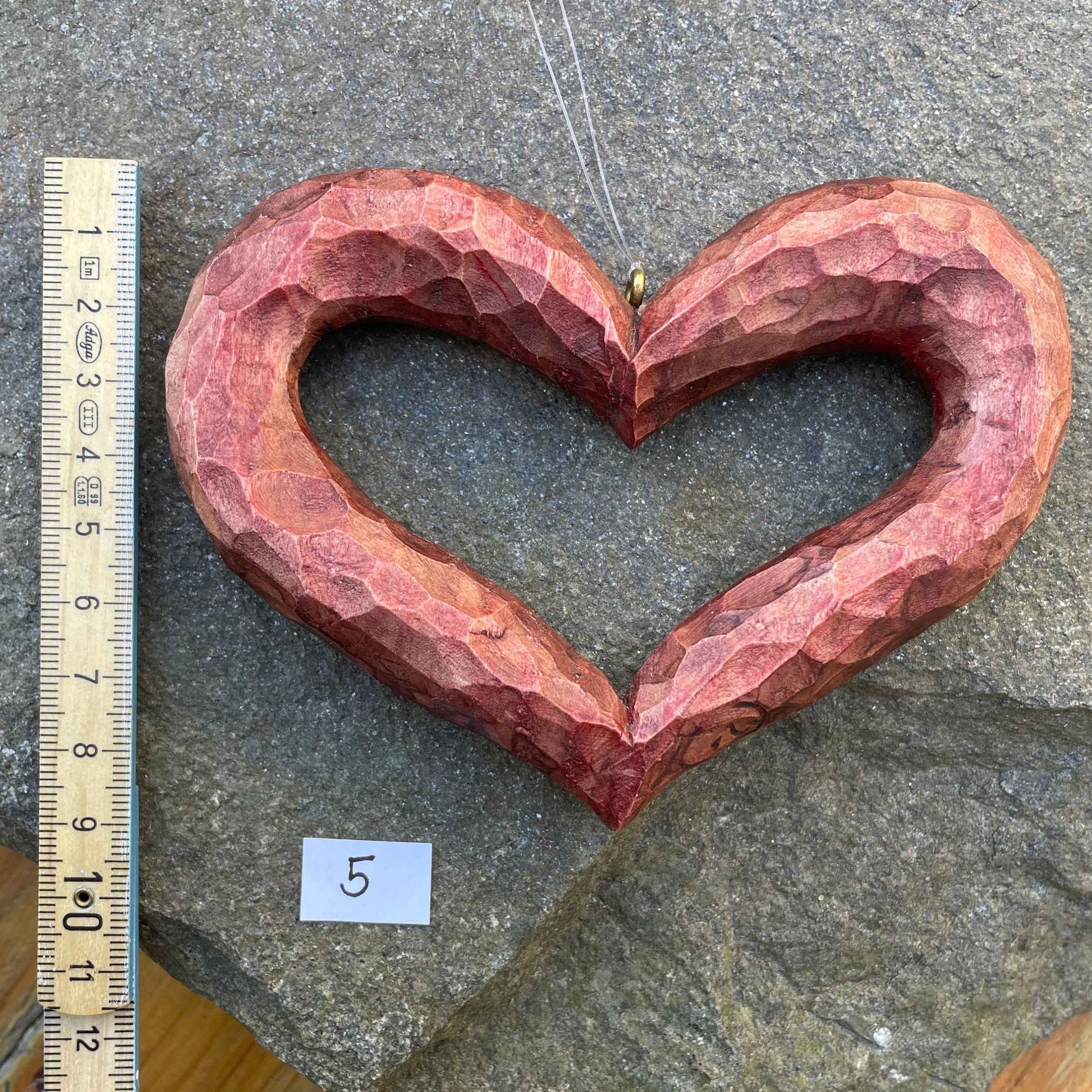 In reiner Handarbeit geschnitzt; Kanten und Fläche werden mit dem Messer definiert. Die matte Färbung wird dünn aufgetragen, damit die Maserung sichtbar bleibt – jedes Herz ist ein Einzelstück.