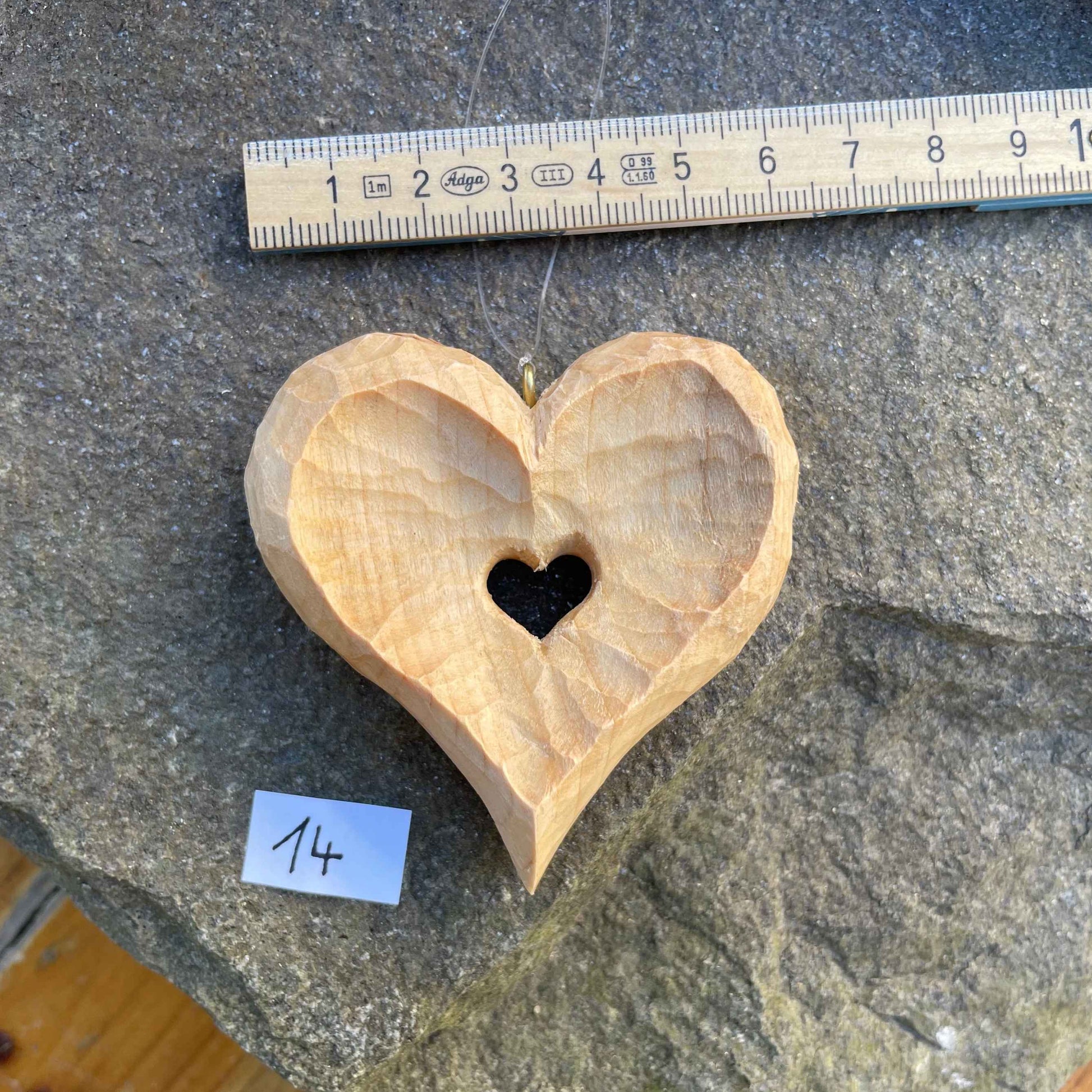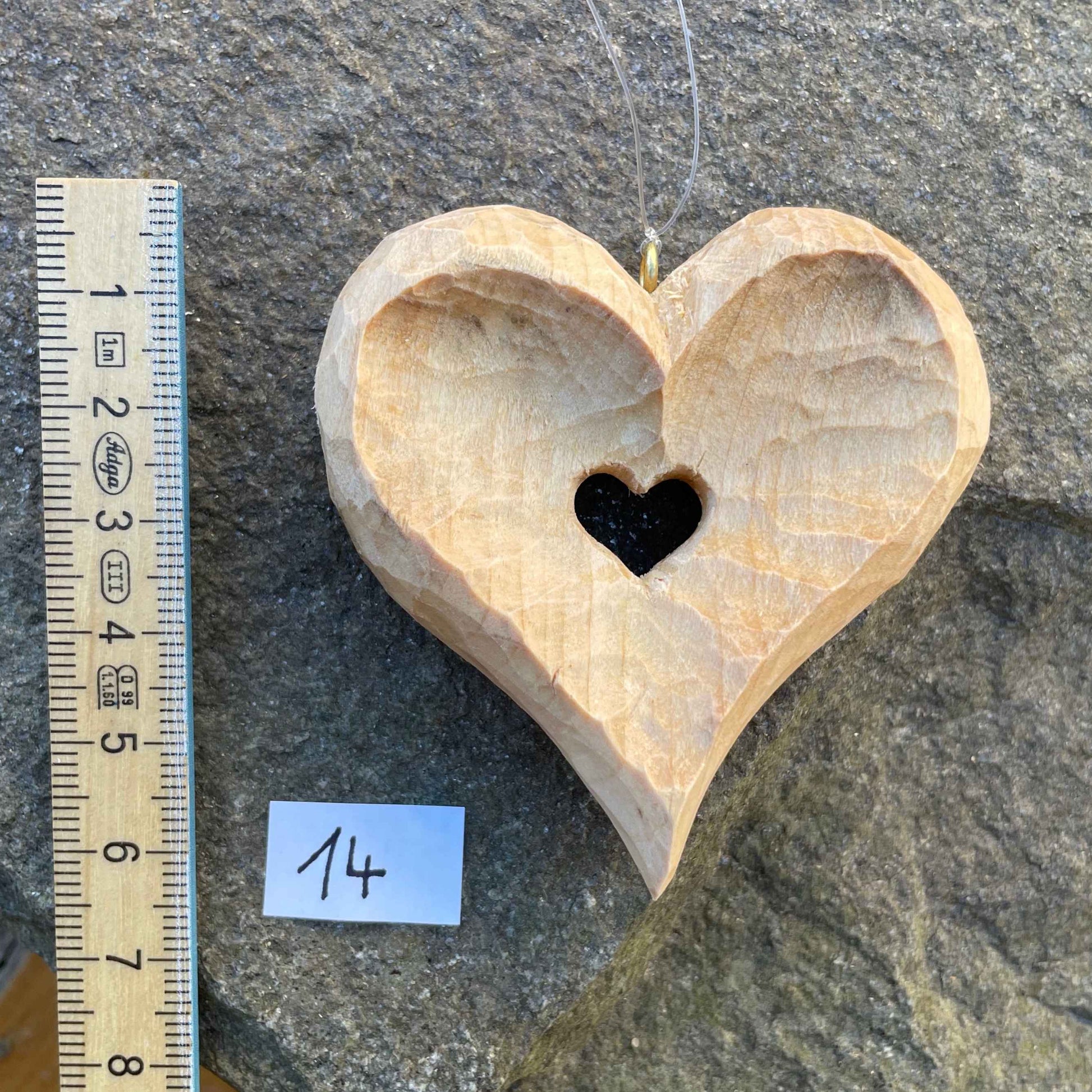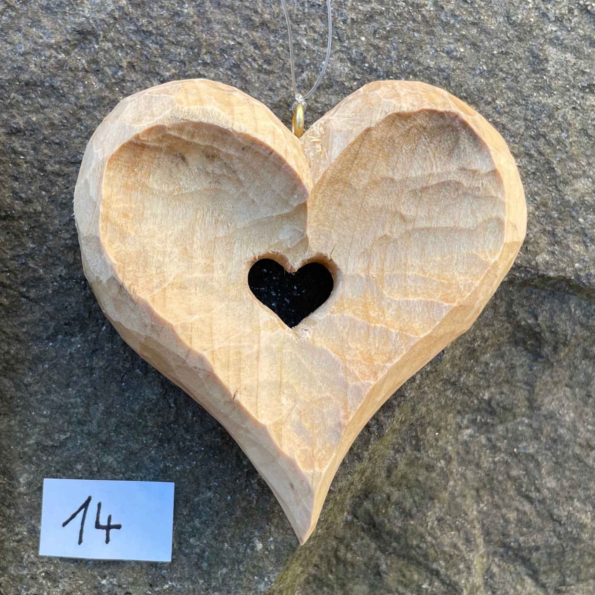 Unser Klassiker: Von Hand geschnitzt, die Innenflächen konkav vertieft – ein kleines Herz im Herz als Symbol für Hoffnung & Zuversicht. Oberfläche gewachst, mit Öse zur Aufhängung.