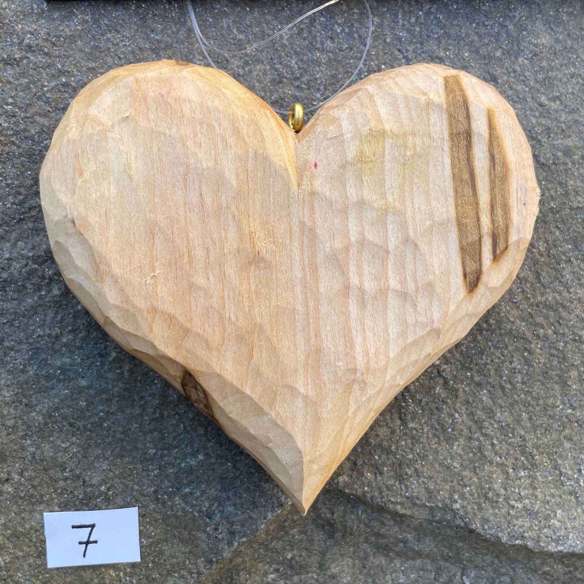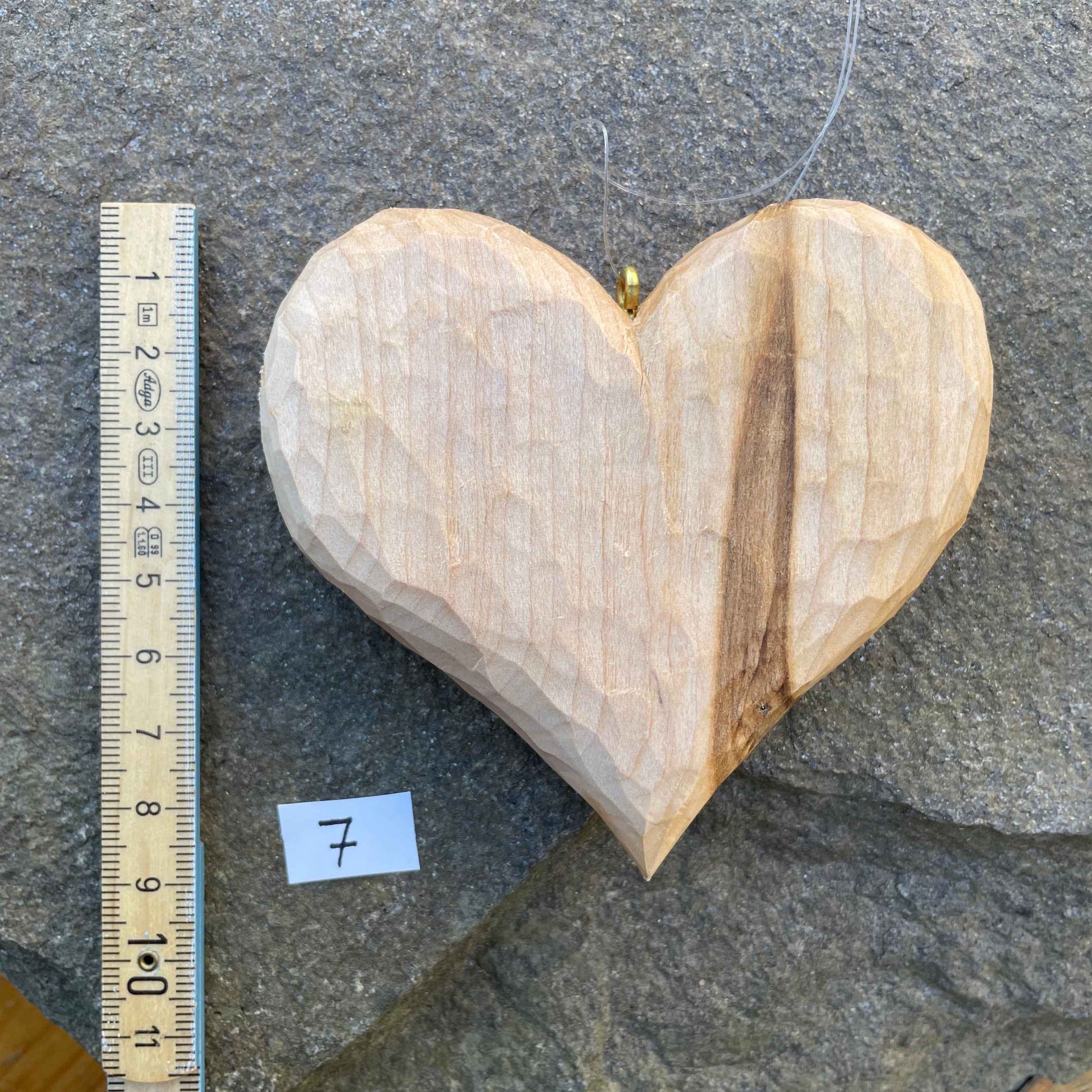 Form und Kanten werden komplett mit dem Messer ausgearbeitet. Wachs wird dünn aufgetragen, damit die natürliche Maserung sichtbar bleibt – jedes Herz ist in Linienführung und Holzbild einzigartig.
