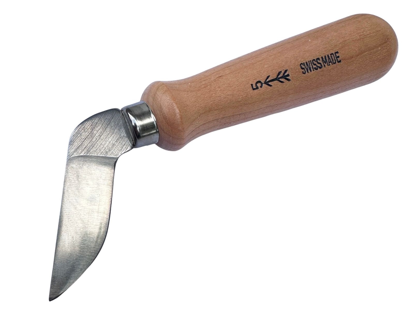 Spezialform mit hakenförmig gebogener Klinge (55 mm) zum Erreichen vertiefter Bereiche von oben – ideal für einhändiges Arbeiten an kleinen Werkstücken und schwer zugänglichen Stellen. Swiss Made, ab Werk geschärft & poliert.