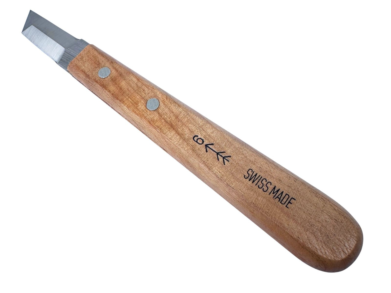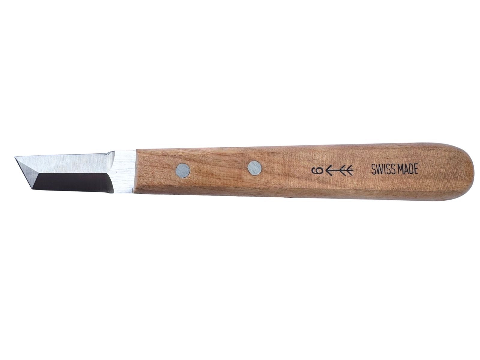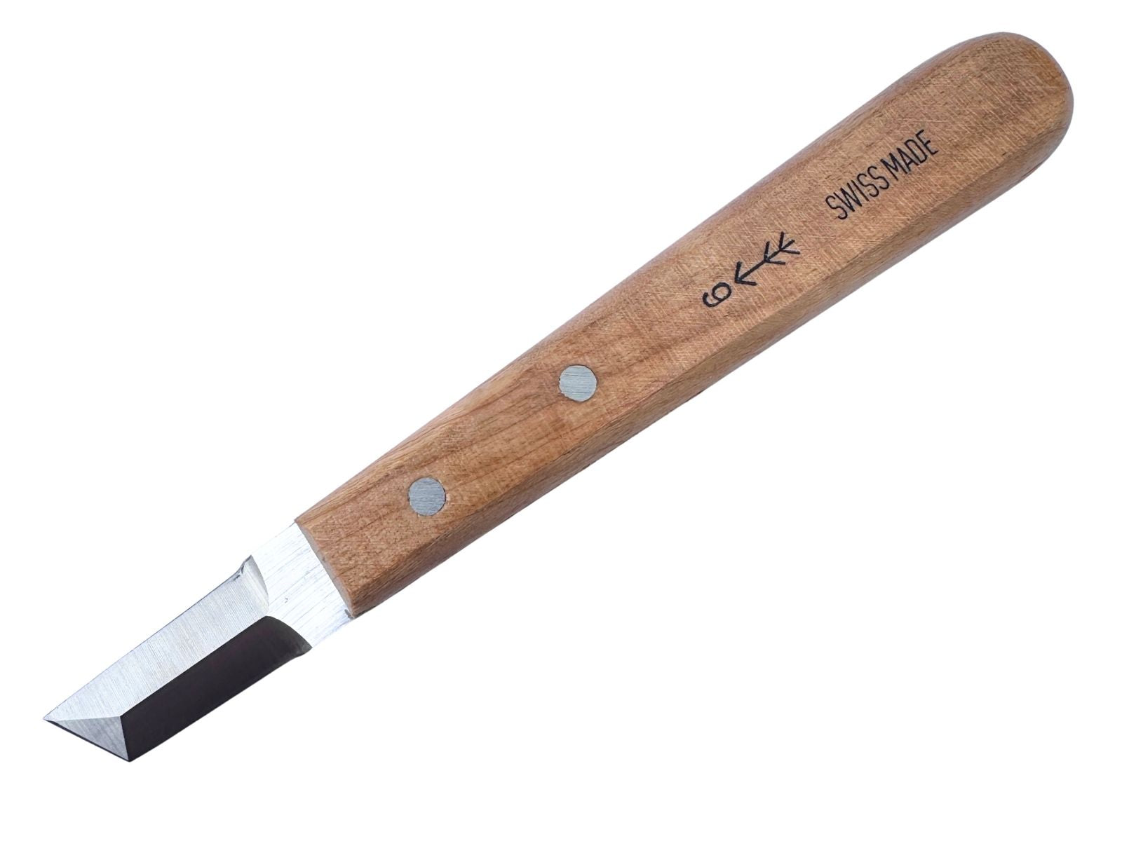Dreikant-Klinge (ca. 40 mm) mit drei Schneiden für präzise V-Schnitte, An- und Absätze sowie feine „Stop-Cuts“. Swiss Made, ab Werk geschärft & poliert – auspacken und schnitzen.