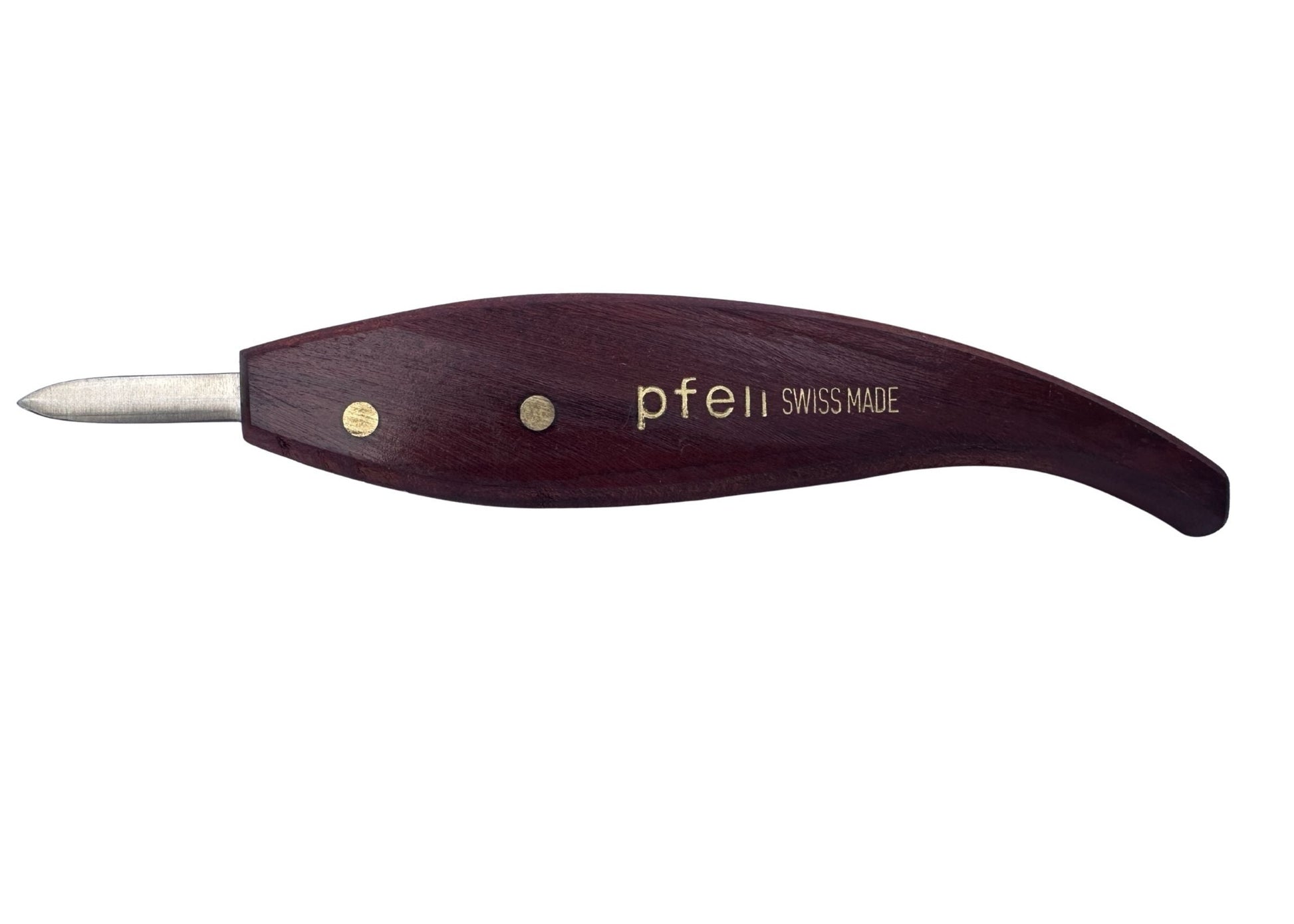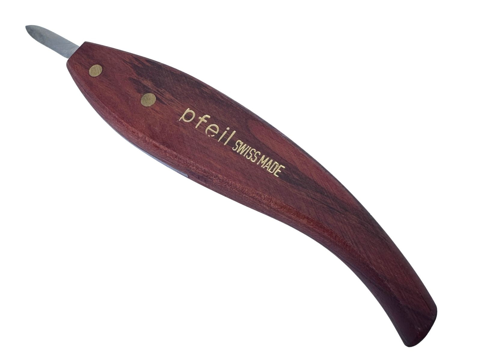 Feines Chip-Carving-Messer mit gebogener, dünn ausgeschliffener Klinge (30 mm) für weiche Kurven und saubere, ziehende Schnitte. Swiss Made, ab Werk geschärft & poliert – auspacken und schnitzen.