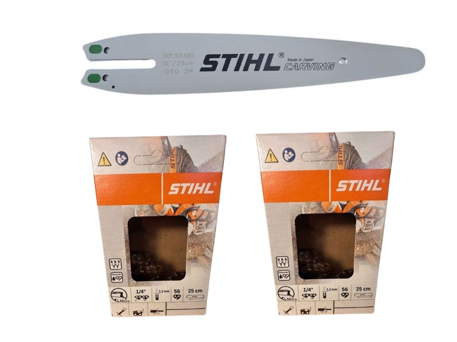 Carving-Bundle für Einsteiger: Vollmetall-Carvingschiene von Stihl – dazu 2× STIHL RMS Ketten (1/4″, 1,3 mm, 56 Treibglieder) für feines, kontrolliertes Schnitzen.